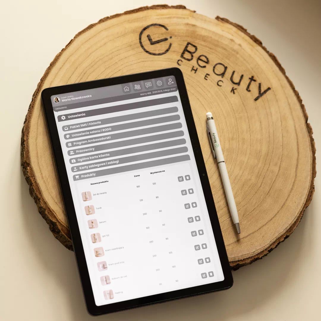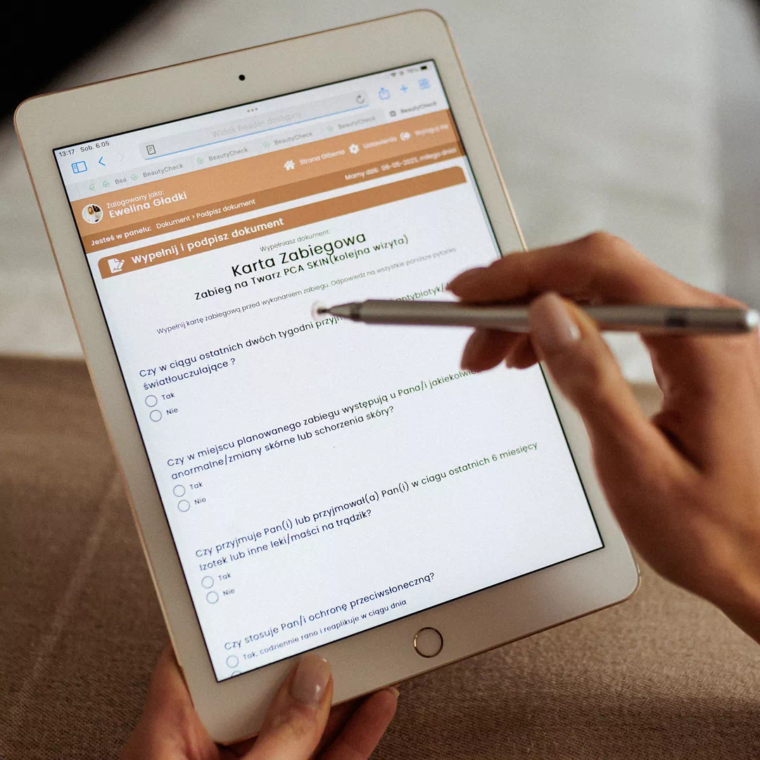 Oszczędzaj czas i miej pewność, że wszystkie formalności są dopięte na ostatni guzik! W BeautyCheck znajdziesz ponad 90 gotowych kart zabiegowych dla kosmetologów, trychologów, podologów, specjalistów medycyny estetycznej, fryzjerów i wielu innych branż beauty. Każdą kartę możesz w pełni edytować i dopasować do swoich potrzeb — dodawaj własne pytania otwarte, zamknięte czy z wielokrotnym wyborem odpowiedzi. Klient podpisuje zgodę wygodnie na tablecie lub potwierdza ją SMS-em. Koniec z drukiem i papierem — wszystko w jednym, bezpiecznym systemie, zawsze pod ręką!